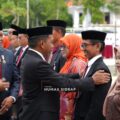 “Alhamdulillah, turunnya hujan hari ini menjadi tanda keberkahan untuk kita semua. Hari ini Anda resmi menjadi ASN, baju Korpri telah melekat. Anda adalah harapan rakyat. Mari bekerja dengan baik, tulus, dan ikhlas,” ujarnya.